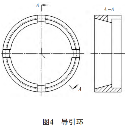 用于密封圈理順的挑針、套于螺紋上防止螺紋劃傷 密封圈的導(dǎo)套和保護(hù)圈校正的校正棒、收壓板、收壓套等 都屬密封件安裝的常用工裝,除此之外,一些設(shè)計(jì)上因結(jié) 構(gòu)受限而無法處理的槽或孔必須借助工裝來進(jìn)行彌補(bǔ), 否則密封圈的損傷無法消解。圖4所示為圖5某活塞組件結(jié)構(gòu)的輔助工裝實(shí)例,從中可以看出,如果不使用導(dǎo)引環(huán) 對襯套右端為了傳力板角向定位而銑掉的部分進(jìn)行補(bǔ) 形,在活塞壓入襯套時(shí),必然會(huì)成為活塞上的密封圈在該 位置鼓出的誘因,所以該活塞組件的傳力板、拉桿應(yīng)選在活塞壓入襯套之后安裝。同理,對閥套上不能開環(huán)形凹槽 過渡處理的交叉孔,也可以使用工藝柱銷進(jìn)行補(bǔ)形。