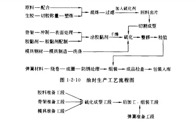 骨架油封作為旋轉(zhuǎn)軸唇形密封圈(通常稱為油封)因具有結(jié)構(gòu)簡(jiǎn)單、拆裝方便,密封可靠等特點(diǎn)而被廣泛使用,因而,對(duì)其研究也越來越深人,從而極大地提高了油封的使用性能。近年來,隨著機(jī)械、車輛、航空等工業(yè)的高速發(fā)展,對(duì)油封的使用性能也提出了越來越高的要求。   骨架油封的生產(chǎn)流程大體上由以下六個(gè)工段組成:膠料準(zhǔn)備工段,模具準(zhǔn)備工段,骨架準(zhǔn)備工段;彈簧準(zhǔn)備工段,產(chǎn)品硫化成型工段,后加工組裝工段。因此,其工藝流程基本組成。