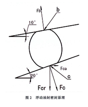 浮封環(huán)需成對使用,一個(gè)隨旋轉(zhuǎn)件旋轉(zhuǎn)(動環(huán)),另一個(gè)相對靜止(定環(huán)),在動環(huán)與浮封座之間以及在定環(huán)與浮封座之間的錐面處,各裝入一個(gè)具有圓形斷面的橡膠圈,在裝配預(yù)緊力作用下橡膠圈在浮封座形成的密封腔內(nèi)受軸向壓縮產(chǎn)生變形。產(chǎn)生垂直于浮封座錐面的彈力 Fb 和垂直浮封環(huán)錐面的彈力 Fc,彈力 Fc 分解為軸向分力 Fca 和徑向分力 Fcr。彈力 Fb 是橡膠圈與浮封座錐面緊密接觸實(shí)現(xiàn) b 處密封,彈力 Fc 是橡膠圈與浮封環(huán)錐面緊密接觸實(shí)現(xiàn) c 處密封,軸向分力 Fca 使兩浮封環(huán)密封面緊密接觸,實(shí)現(xiàn) a 處密封,最終實(shí)現(xiàn)整個(gè)密封系統(tǒng)的 5 處密封要求(見圖 2)。