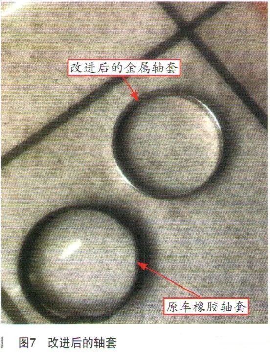 從改進(jìn)的軸套可以看出,金屬軸套可以牢牢把1軸固定,不像橡膠軸套,易造成1軸跳動(dòng),如圖7所示。
