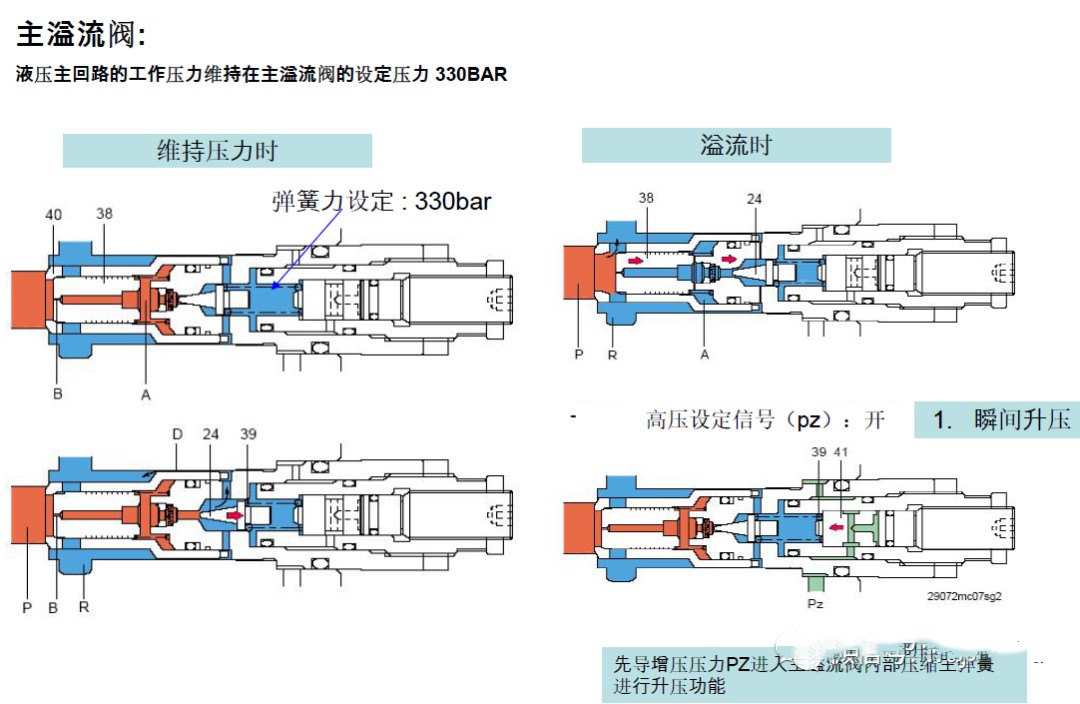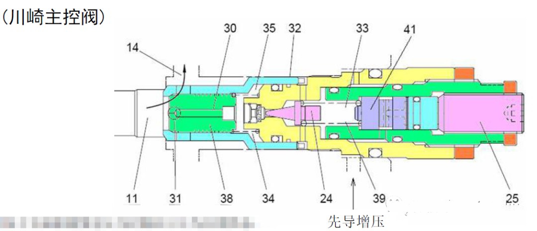 動(dòng)力增壓時(shí),通過(guò)先導(dǎo)增壓油道流入的壓力(增壓用先導(dǎo)壓力),通過(guò)側(cè)面的油路流入活塞(41)的側(cè)孔,推壓活塞(41),使彈簧(39)的設(shè)定壓力上升。