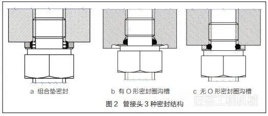 可調(diào)向端螺母密封直角接頭標準要求,如果柴油箱內(nèi)螺紋端部加工有 O 形密封圈溝槽,可在外螺紋端加裝 O 形密封圈,將過渡管接頭及螺母直接擰在內(nèi)螺紋上,如圖 2b 所示。如果內(nèi)螺紋端部無 O 形密封圈溝槽,則需在 O 形密封圈外側(cè)配上擋圈,如圖 2c 所示。
