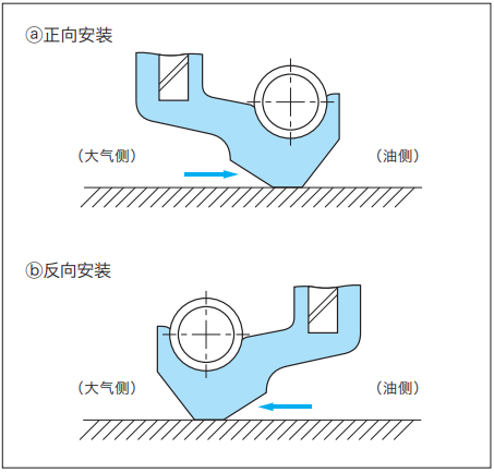?是正向安裝時油的密封狀態(tài),也就是 大氣被送入油側(cè)的狀態(tài),?是反向安裝時油向大氣側(cè)泄漏的狀態(tài)。