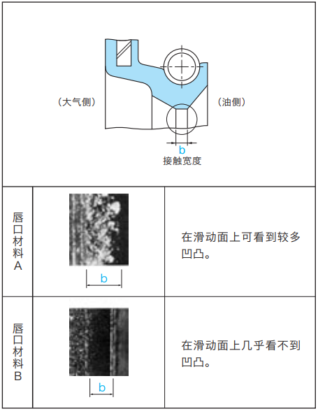 所示為唇口材料不同時的滑動面狀態(tài),我們 可以看到唇口材料 A 比唇口材料 B 在滑動面上形成的凹凸更多。