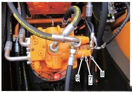 如果回轉(zhuǎn)溢流壓力不正常,按下列順序調(diào)整回轉(zhuǎn)馬達(dá)安全閥(6)