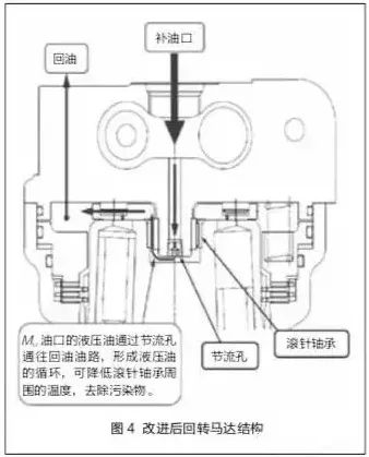我們在回轉(zhuǎn)馬達(dá)滾針軸承上新增加補(bǔ)油口,并通過單向閥與液壓油箱連接,單向閥開啟壓力即為補(bǔ)油口背壓,一般為0.5MPa。補(bǔ)油口是為回轉(zhuǎn)馬達(dá)停止時釋放壓力與消除氣穴設(shè)置的油口,可為回轉(zhuǎn)馬達(dá)補(bǔ)充液壓油及釋放壓力。為了改進(jìn)滾針軸承潤滑不良的狀況,我們在回轉(zhuǎn)馬達(dá)殼體上增加了節(jié)流孔,形成補(bǔ)油口-節(jié)流孔-回油口的油道。改進(jìn)后回轉(zhuǎn)馬達(dá)結(jié)構(gòu)如圖4所示。