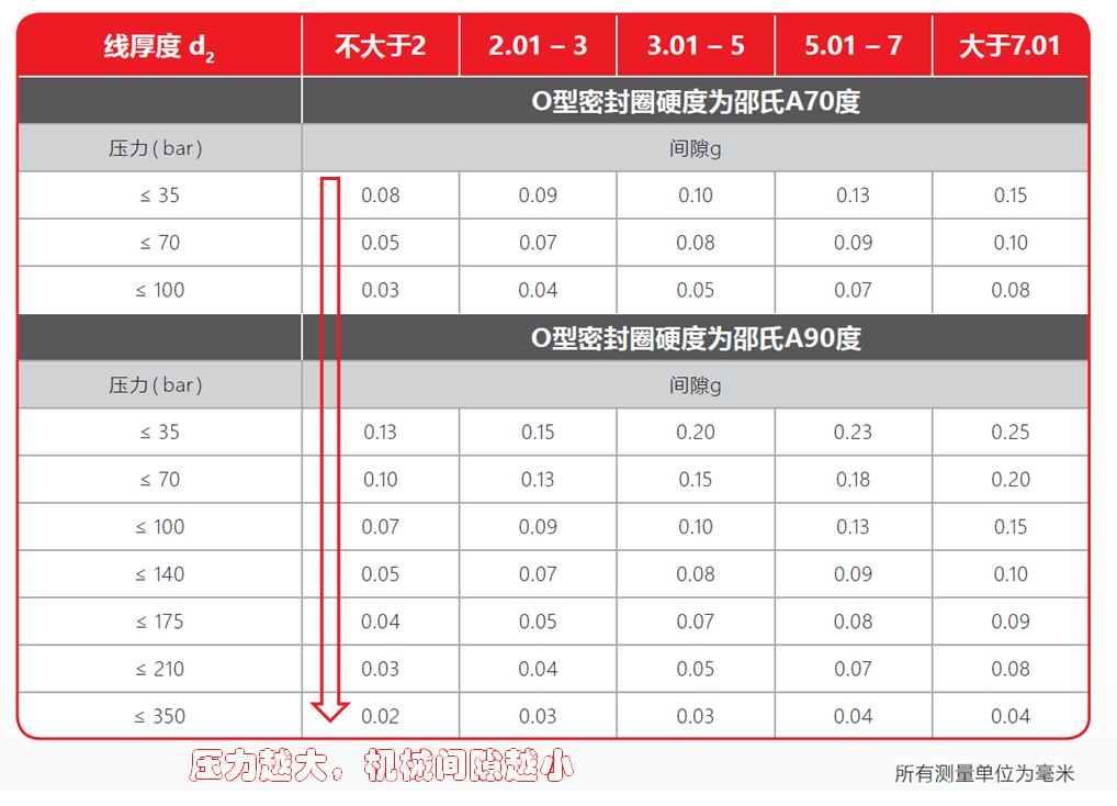 線徑、所受壓力、機(jī)械間隙、硬度四者之間的關(guān)系表,可供設(shè)計時參考。粗略的看,總的設(shè)計原則就是——壓力越大,機(jī)械間隙就要越小。