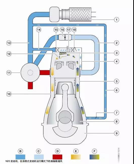 這是N20發(fā)動(dòng)機(jī)的曲軸箱強(qiáng)制通風(fēng)系統(tǒng)的工作路徑和原理。