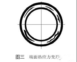 3.熱變形(見圖三)  密封面上有對稱不連續(xù)的亮帶,這是由于熱變形引起的。有時,這種狀態(tài)觀察不出來,只有在端面上涂以紅丹粉,通過與平面輕輕研磨才能發(fā)現(xiàn)。出現(xiàn)這種情況,主要是由于不規(guī)則的冷卻,引起密封面的熱應(yīng)力變形。