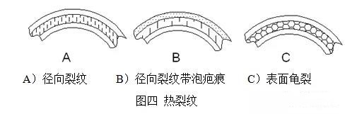 4.熱裂紋(見圖四)  密封面上產(chǎn)生的細裂紋有三種:A)徑向裂紋;B)徑向裂紋帶有水泡或疤痕;C)表面龜裂。陶瓷或硬質(zhì)合金環(huán)密封面尤其容易產(chǎn)生這種損傷。這種裂紋象切削刀刮削碳石墨環(huán)或其它材料的密封面一樣,會很快使對磨的軟環(huán)凸臺消失完。產(chǎn)生熱裂最普遍的原因是:缺乏適當?shù)臐櫥屠鋮s措施,密封面液膜汽化蒸發(fā),PV值高等。