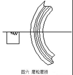 6.磨粒磨損(見圖6  磨粒磨損通常是由于嵌入軟環(huán)內(nèi)或附夾在端面間的顆粒所引起的。后者比前者引起的磨損小。前者磨損往往出現(xiàn)在硬環(huán)端面上,呈圓周溝槽且同心分布。圖中的碳化鎢硬質(zhì)合金的磨損痕跡即位一例。