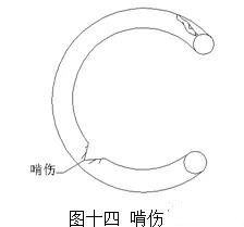 14.橡膠O型圈擠裂啃傷(圖十四)由于座孔和軸端未倒角,或殘留毛刺,O型圈裝入時被啃傷劃破。
