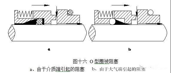 16O型圈處被阻塞(圖十六)在密封介質(zhì)的一側(cè),由于固體物料比率高或纖維物料多,補償環(huán)作浮動調(diào)整時,固體物或雜質(zhì)進入期間,產(chǎn)生阻塞,補償環(huán)不能作軸向滑移和浮動調(diào)整;在大氣一側(cè),由于液膜蒸發(fā)、冷凝沉積、分離蒸餾,引起濃縮物的堆積、也能阻塞O型圈正?;坪驼{(diào)整,從而使密封端面不能接觸而產(chǎn)生泄漏。