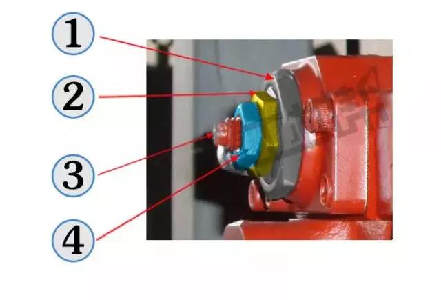 調(diào)整步驟:①用開口扳手松開4(藍(lán)色);② 用開口扳手向里(憋車時(shí)向外)微調(diào)3(紅色,每次按15度左右)調(diào)節(jié)至正常;③擰緊鎖緊螺母4(藍(lán)色)。