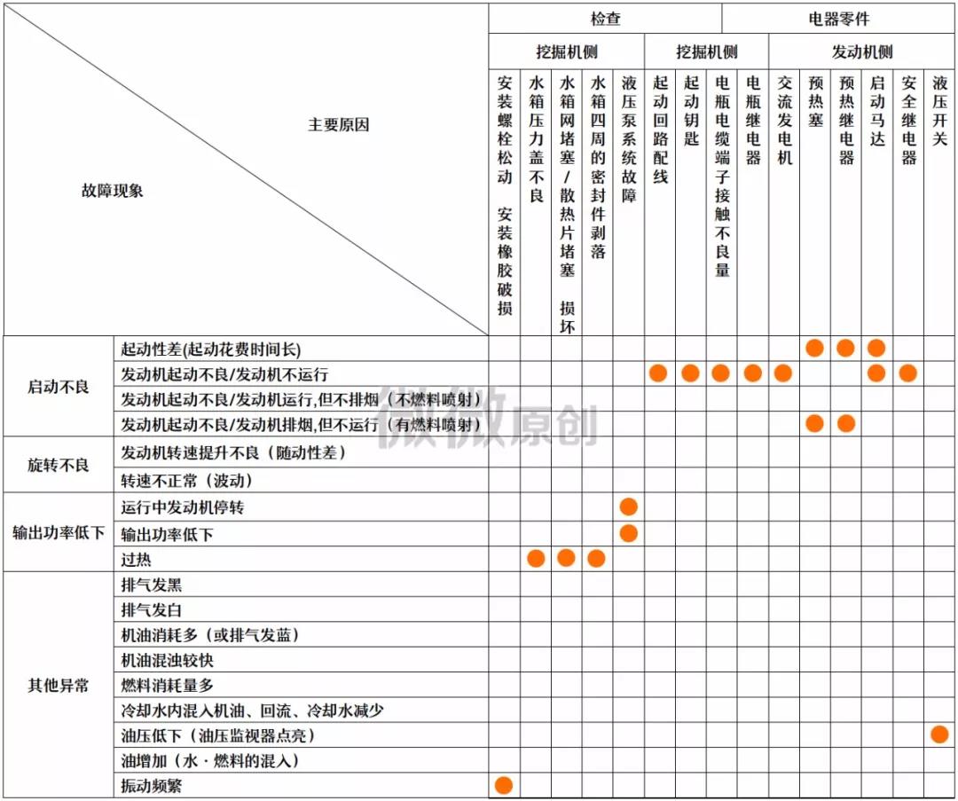 啟動(dòng)不良:起動(dòng)性差(起動(dòng)花費(fèi)時(shí)間長) ;發(fā)動(dòng)機(jī)起動(dòng)不良/發(fā)動(dòng)機(jī)不運(yùn)行 ;發(fā)動(dòng)機(jī)起動(dòng)不良/發(fā)動(dòng)機(jī)運(yùn)行,但不排煙(不燃料噴射) ;發(fā)動(dòng)機(jī)起動(dòng)不良/發(fā)動(dòng)機(jī)排煙,但不運(yùn)行(有燃料噴射) ;