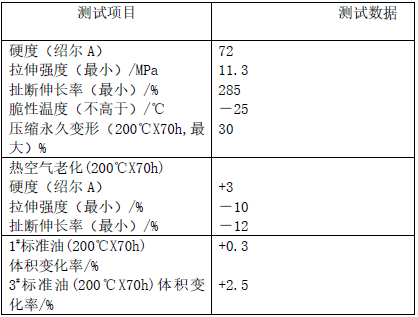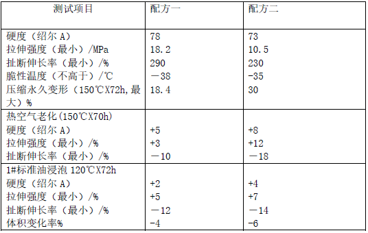 配方二: :氫化丁腈 100;氧化鋅 5;氧化鎂 10;硬脂酸 1;DCP  4;DM 1.5;TAIC 2.5;防老劑ODA 1.5;石蠟 1;N330 50。