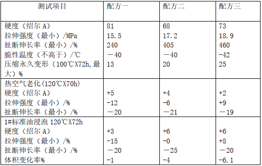 配方一:氫化丁腈橡膠 100;氧化鋅 5;氧化鎂 10;DCP 4;TAIC  2.5;DM 1.5;石蠟 1;硬脂酸 1;N550碳黑  50;防老劑ODA 1。